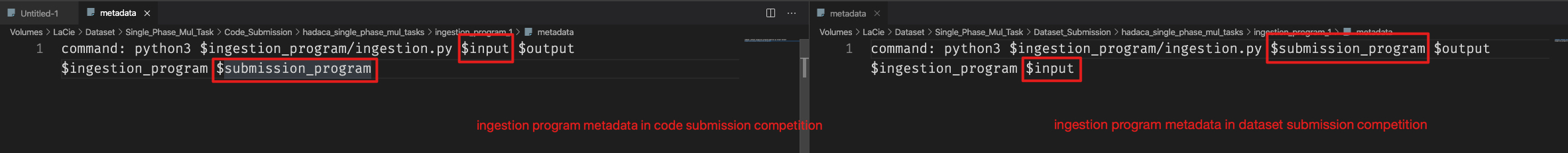 - In a dataset submission competition, the contents of $submission_program is the dataset submitted by the participant, and the contents of $input is the competition creator's built-in sample code submission.