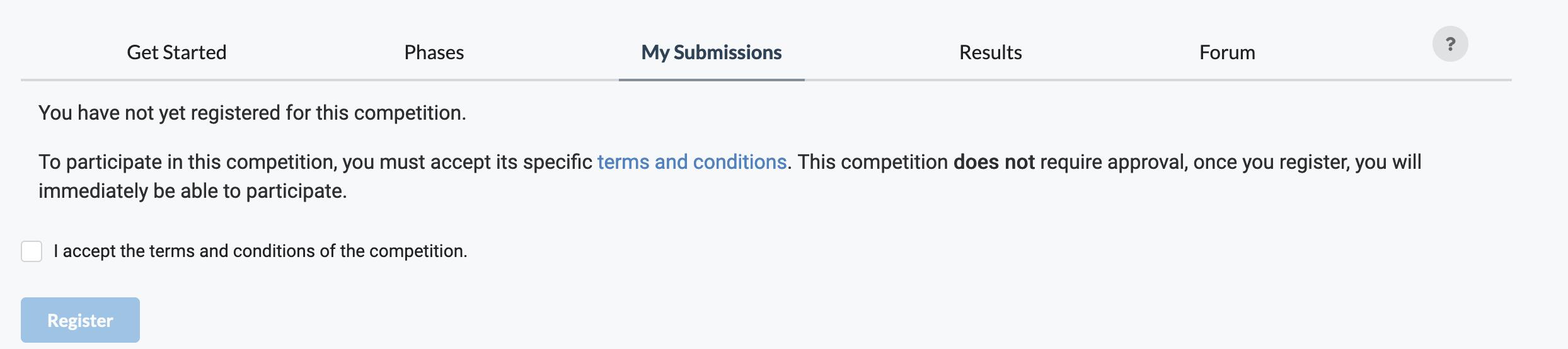 To make an entry in a benchmark click on the "My Submissions" tab, you will then be prompted to accept the rules to register to that benchmark. When registering, a request may be sent to the benchmark organizer. You will be notified when the benchmark organizer has approved your registration request. Follow the instructions of the organizers.
