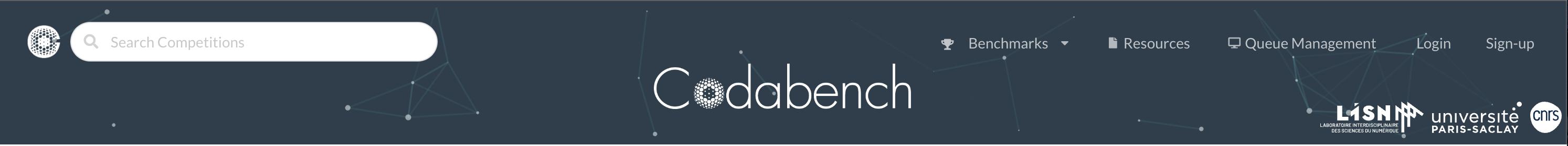 The main banner on the Codabench home page shows 3 organization logos