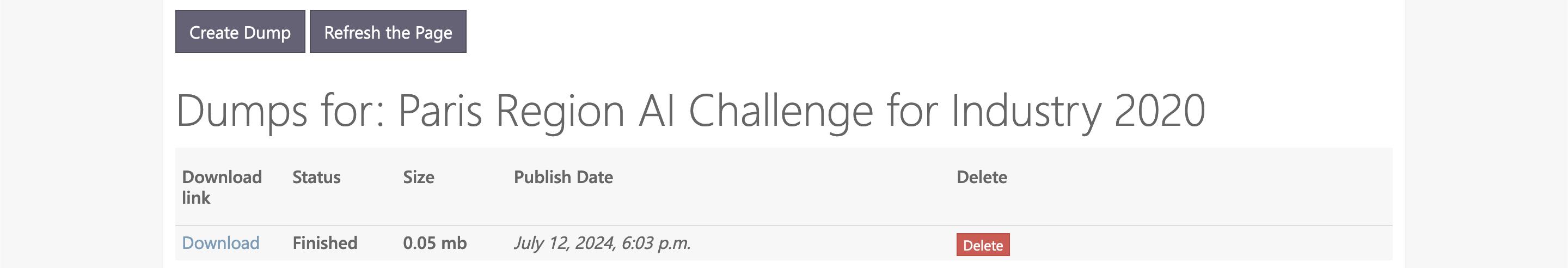 Click on “Create Dump” then “Download”. You’ll obtain a competition bundle that you’ll be able to re-upload on Codabench, following the instructions of the previous section.