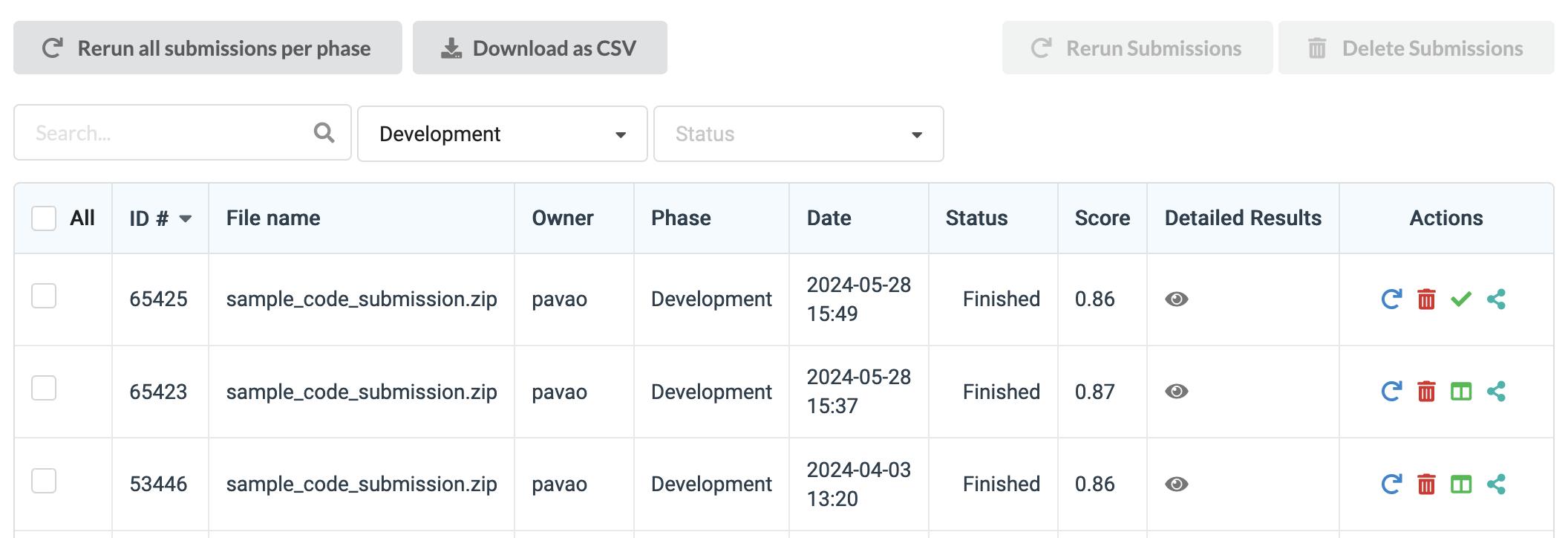 - Re-run all submissions per phase: Re-runs all submissions in a phase.