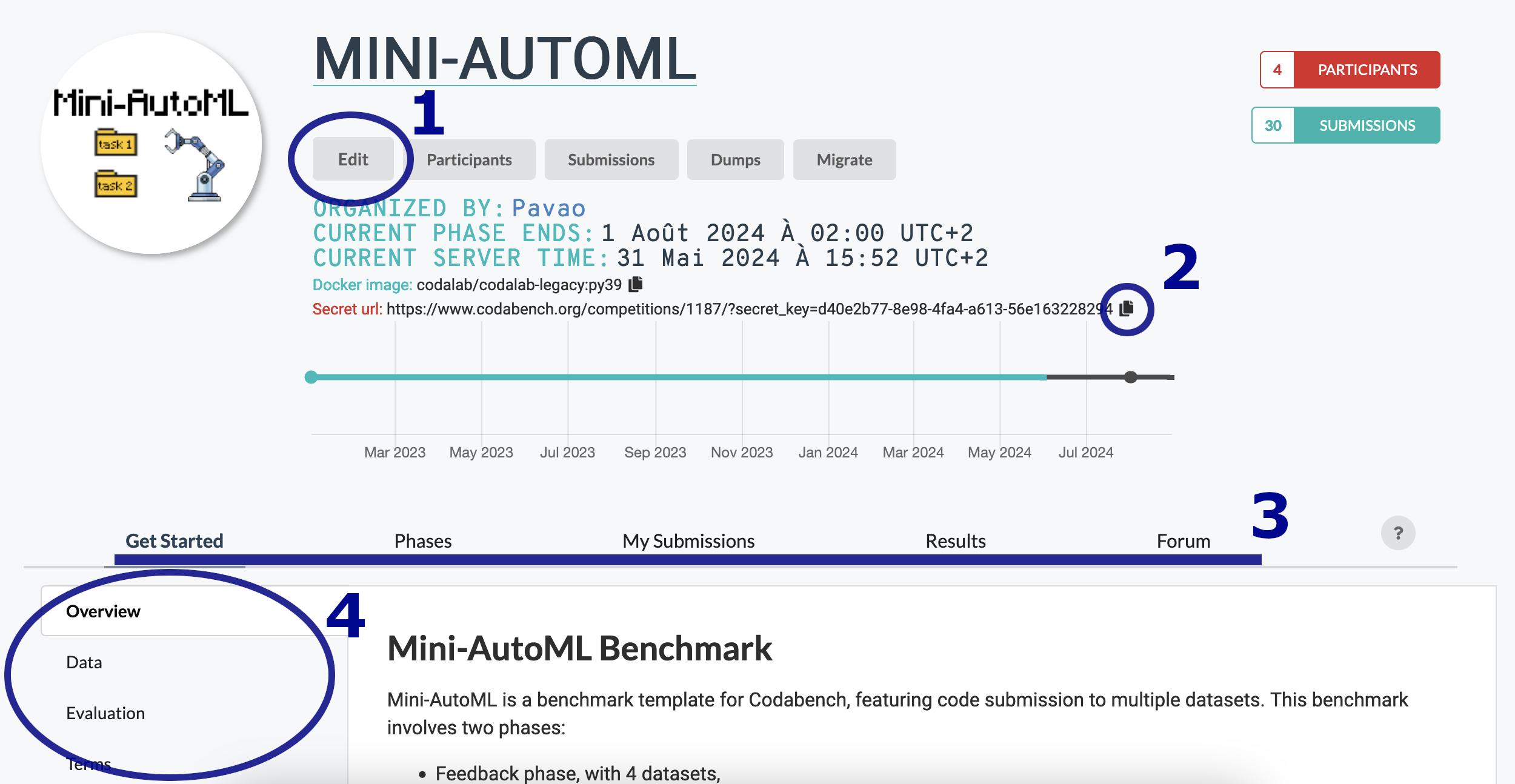 The competition detail page is the main way to interact with competitions. This is where your participants (Or if you are a participant) will read the pages you uploaded, register, make submissions, and check results.