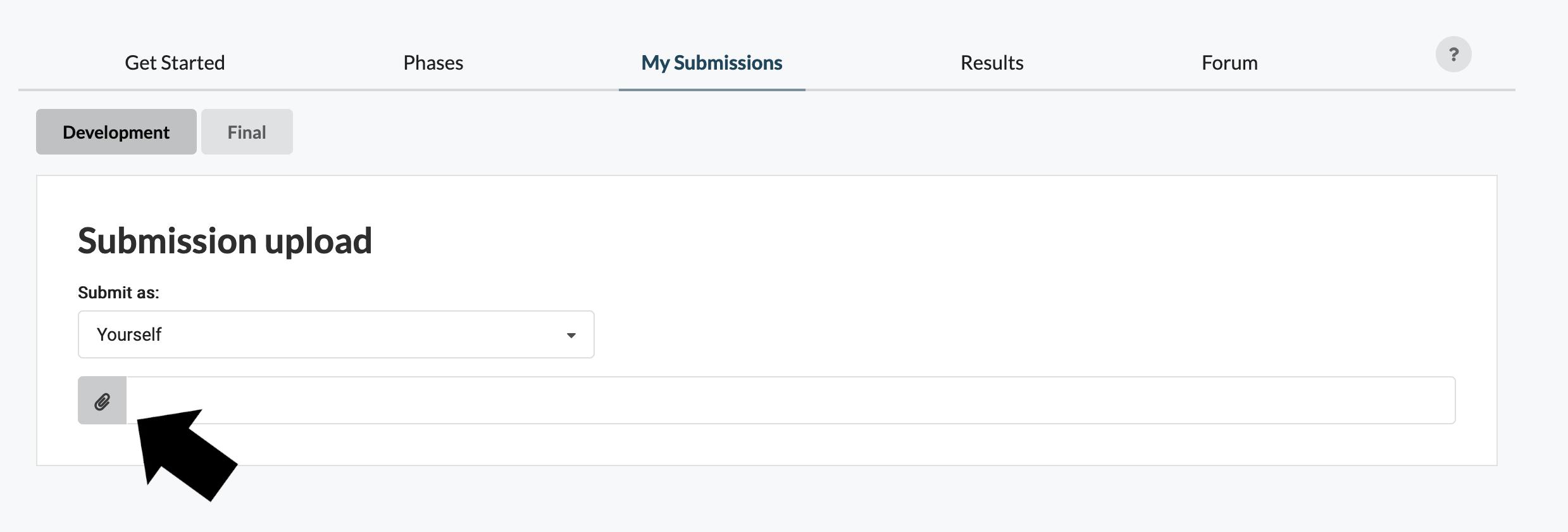 Making a submission to a benchmark involves uploading a bundle (.zip archive) containing files with your answer, in the format that has been specified by the benchmark organizer. There are two types of submissions: - Code submissions contain a metadata file specifying the command to execute - Results submission contain the solution to the problem (no code executed on the platform)